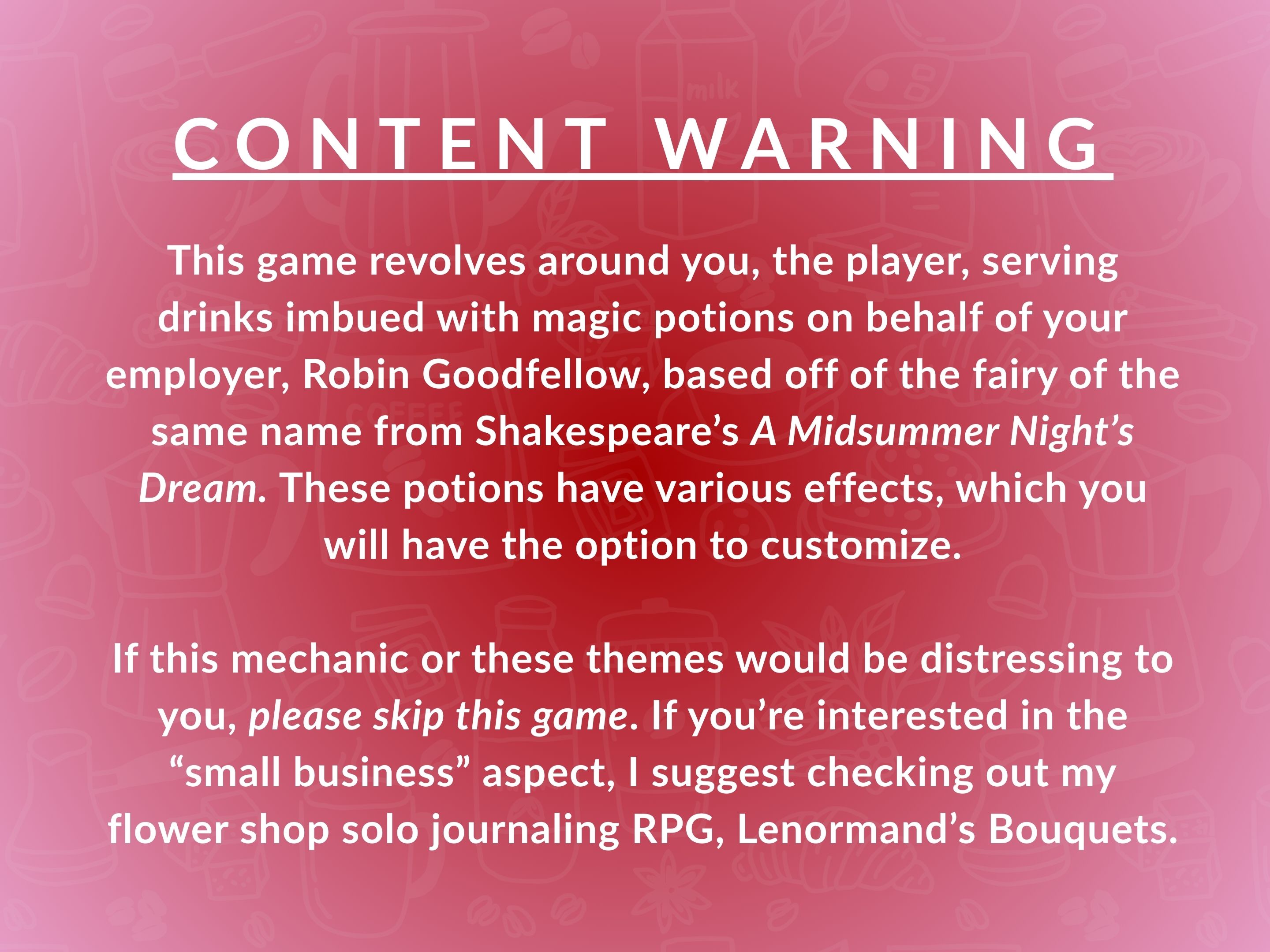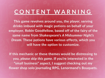 In this cozy solo journaling RPG, you'll serve pairs of customers more than they bargained for in the form of potion-dosed drinks and watch what unfolds between them from the safety of the counter. Your menu is completely customizable, but Robin has gotten you started with a variety of chaos-causing beverages: Amnesia Affogato, Jealousy Juice, Truth Tea-rum, and more!