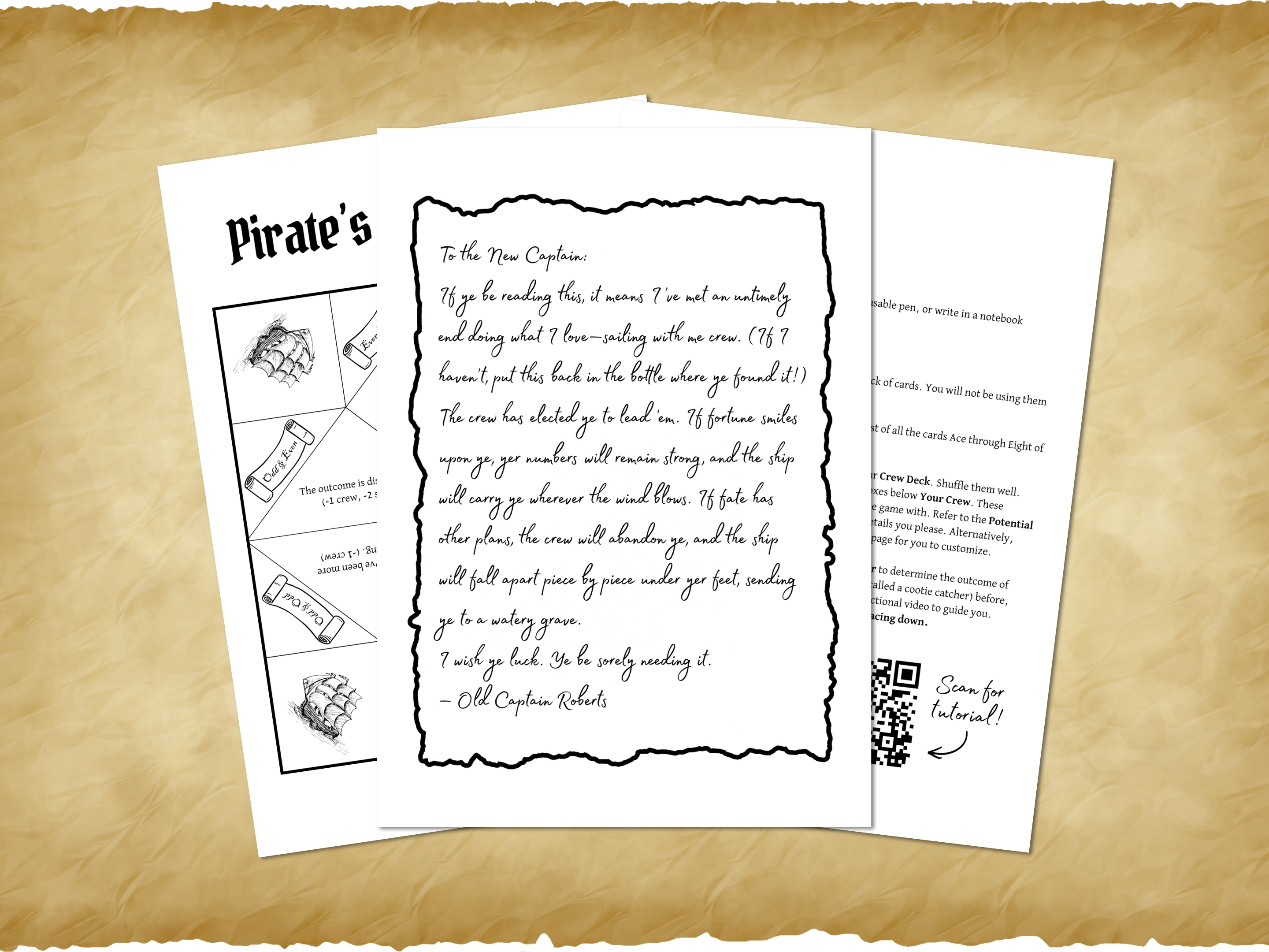In this solo journaling RPG, you inherit the helm of a pirate ship. It's your job to keep the crew alive and the ship in shape as you sail the seas. You'll invent a pirate persona, a ship name and flag to sail under, a crew to take your orders, and write about wherever the wind takes you.