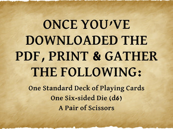 All you need to play is one d6, a deck of playing cards, and a pair of scissors. A complete standalone solo journaling roleplaying game with no prior RPG experience needed—however, some prompts are left intentionally vague to give players more freedom in the stories they tell. Best for players with especially active imaginations!