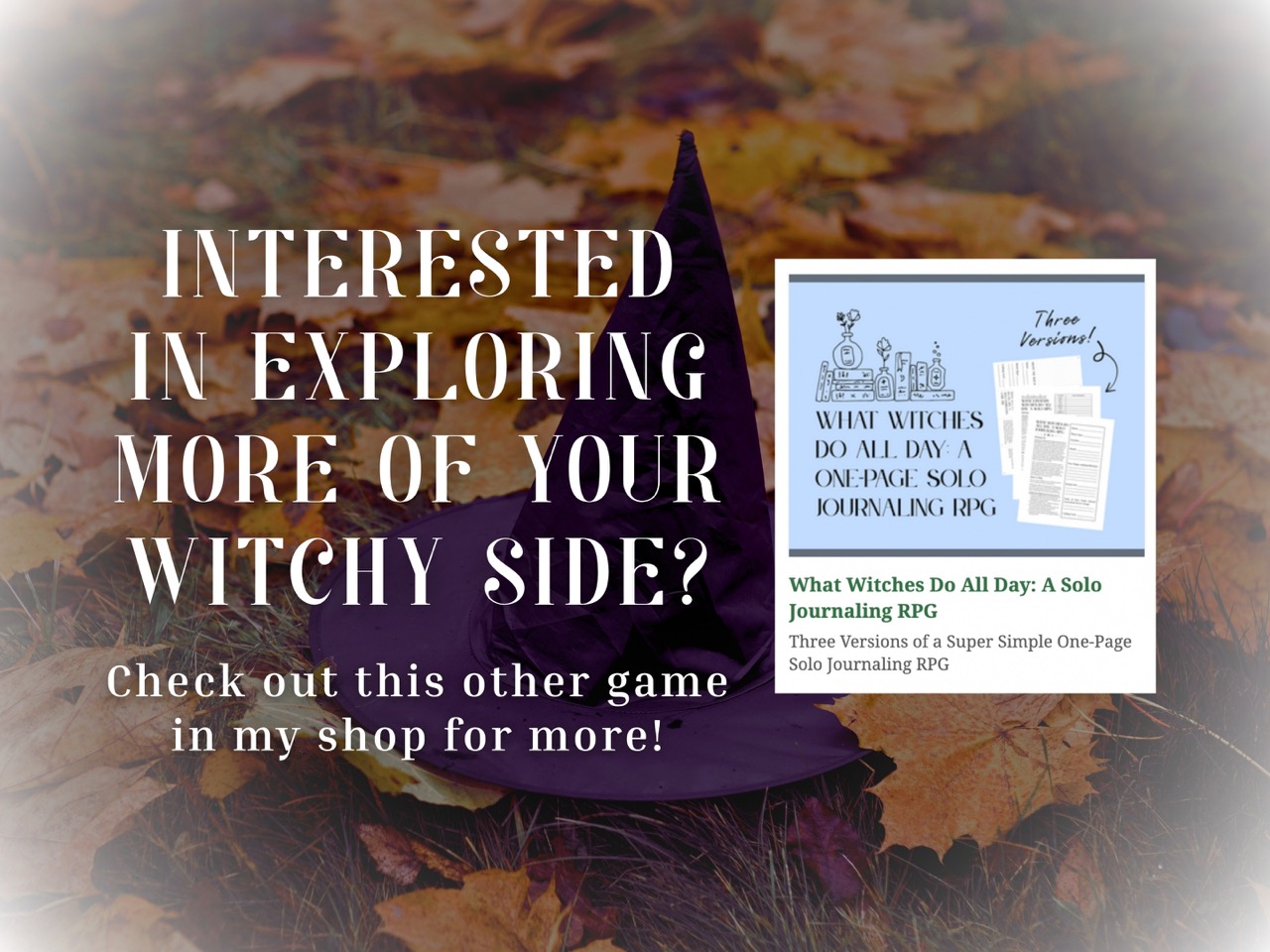Want more witchiness? Try my one-page solo RPG, What Witches Do All Day!